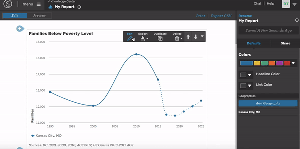 - Create a Bar Chart or Time Series using either your custom uploaded user data or one of mySidewalk’s over 2,000 preloaded datasets.