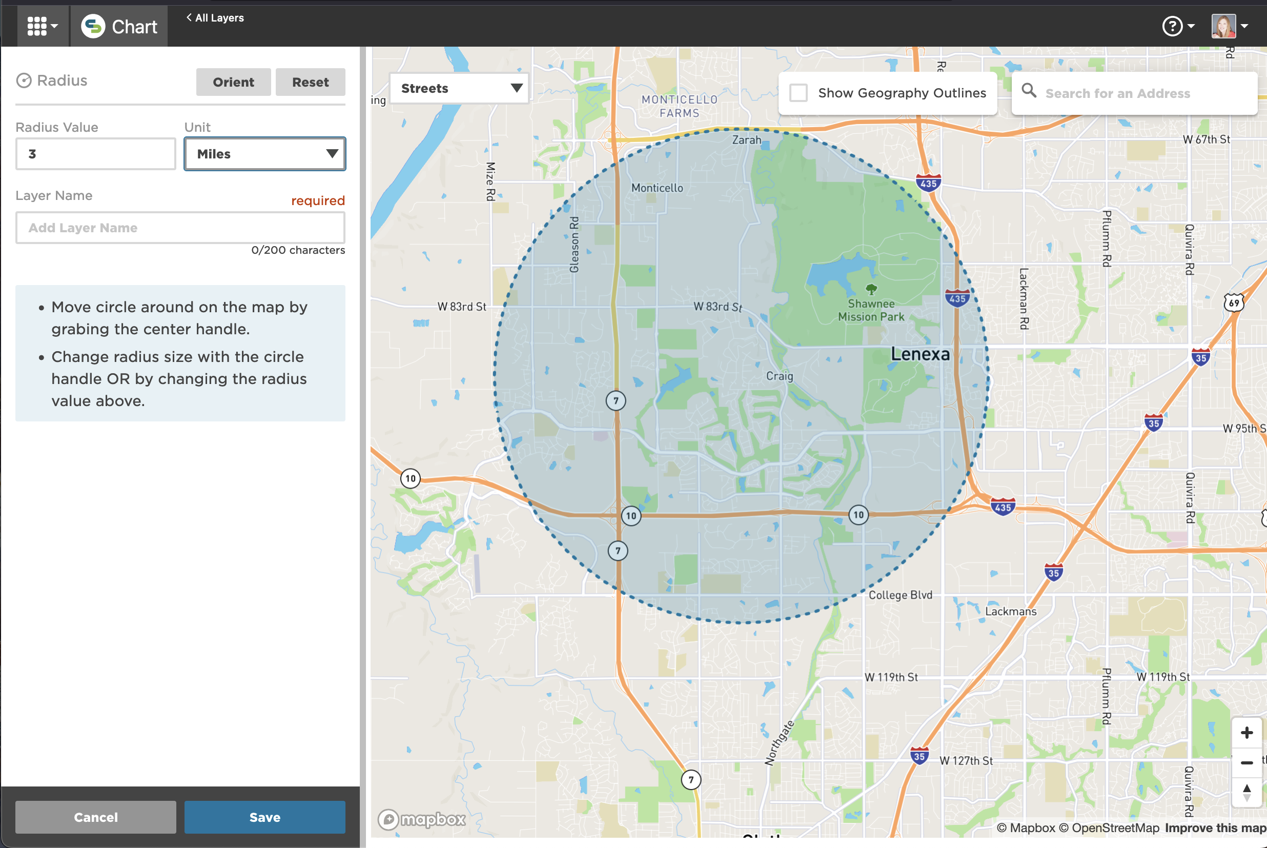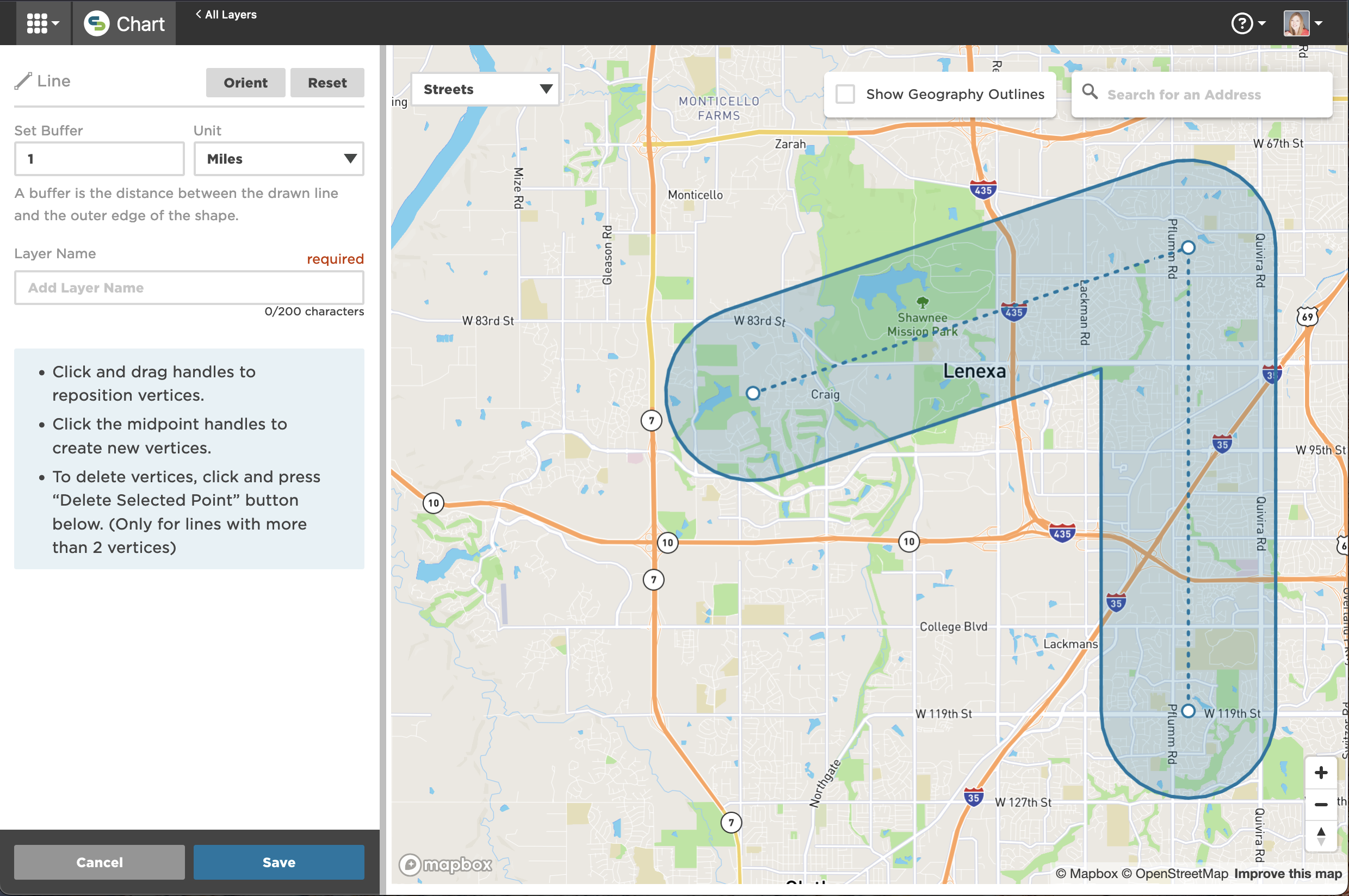 - Adjust the buffer distance (miles or feet) in the left sidebar.