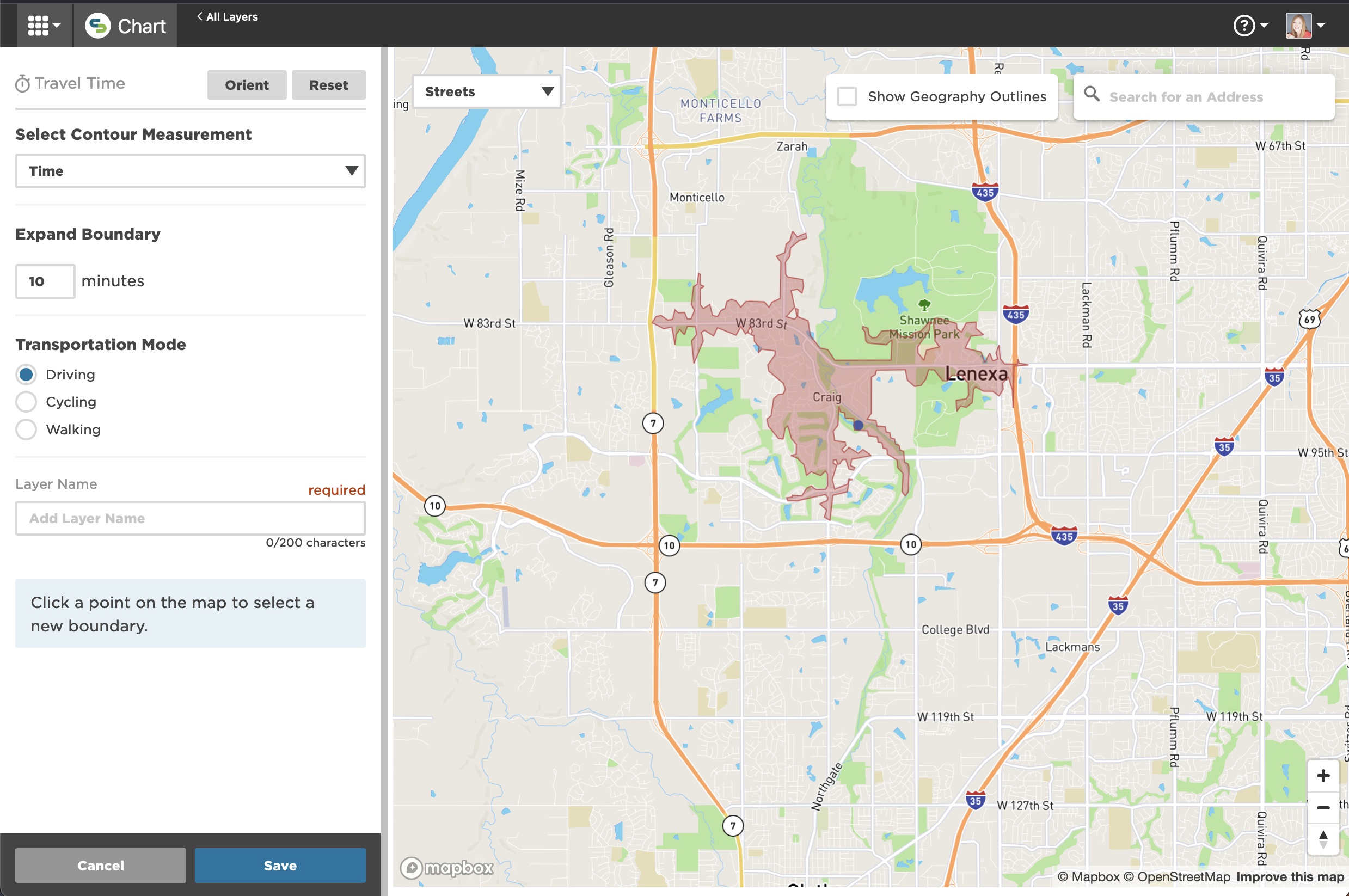 This tool calculates boundaries based on travel time or distance from a specific point.