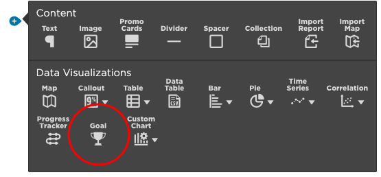 Goal trackers are perfect for keeping your organization accountable. To add one to your report or dashboard, click the blue plus sign where you want your tracker to be added to the page, and then click the Goal icon.