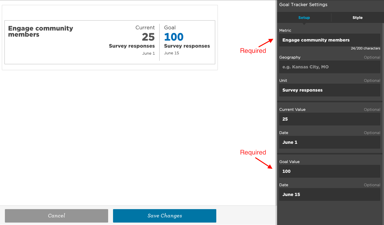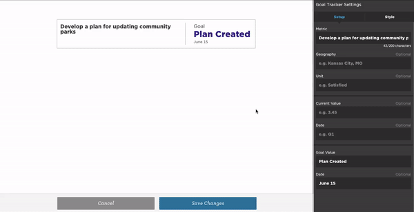 The goal tracker is completely customizable. The only required fields in the Setup tab are the metric of the goal itself, and the goal value. You can keep or remove the current feature by deleting the values under Current Value.