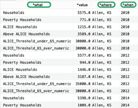 Importantly, this does not change your data; it changes the shape of the file from a wide format to a long format. There are many reasons why long is the preferred shape for storing your data in mySidewalk, but the big ones are: