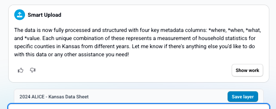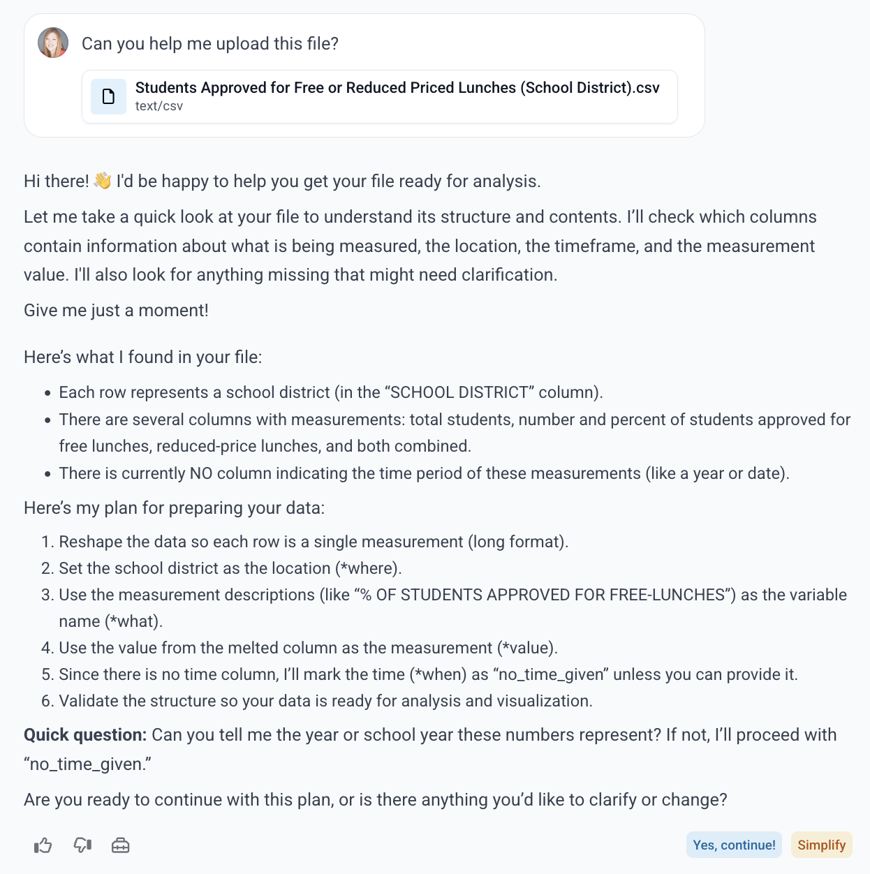 Smart Upload will take a look at your file and tell you what it found, with a particular focus on the pieces it's most interested in: variables, geographies, and time.