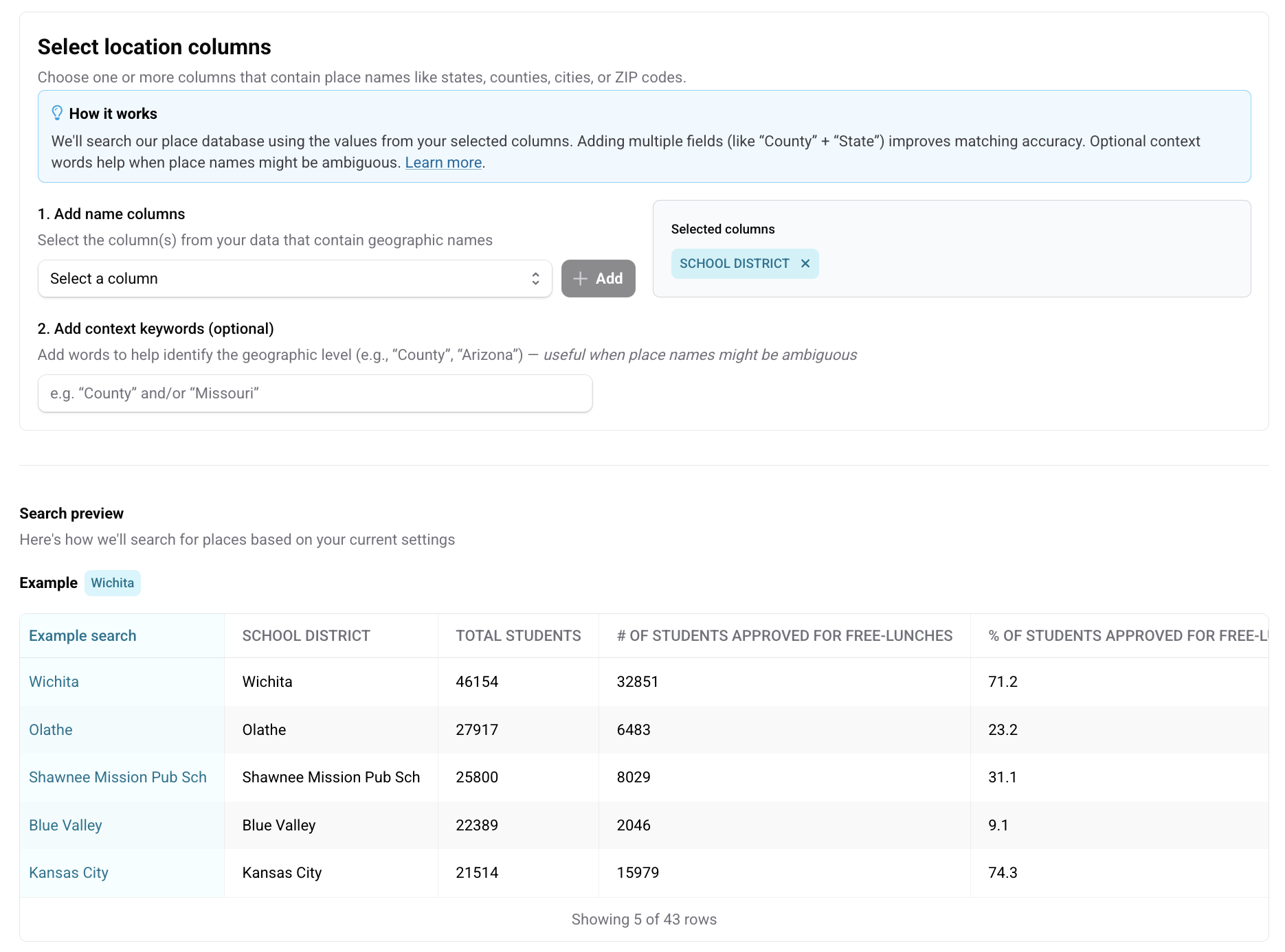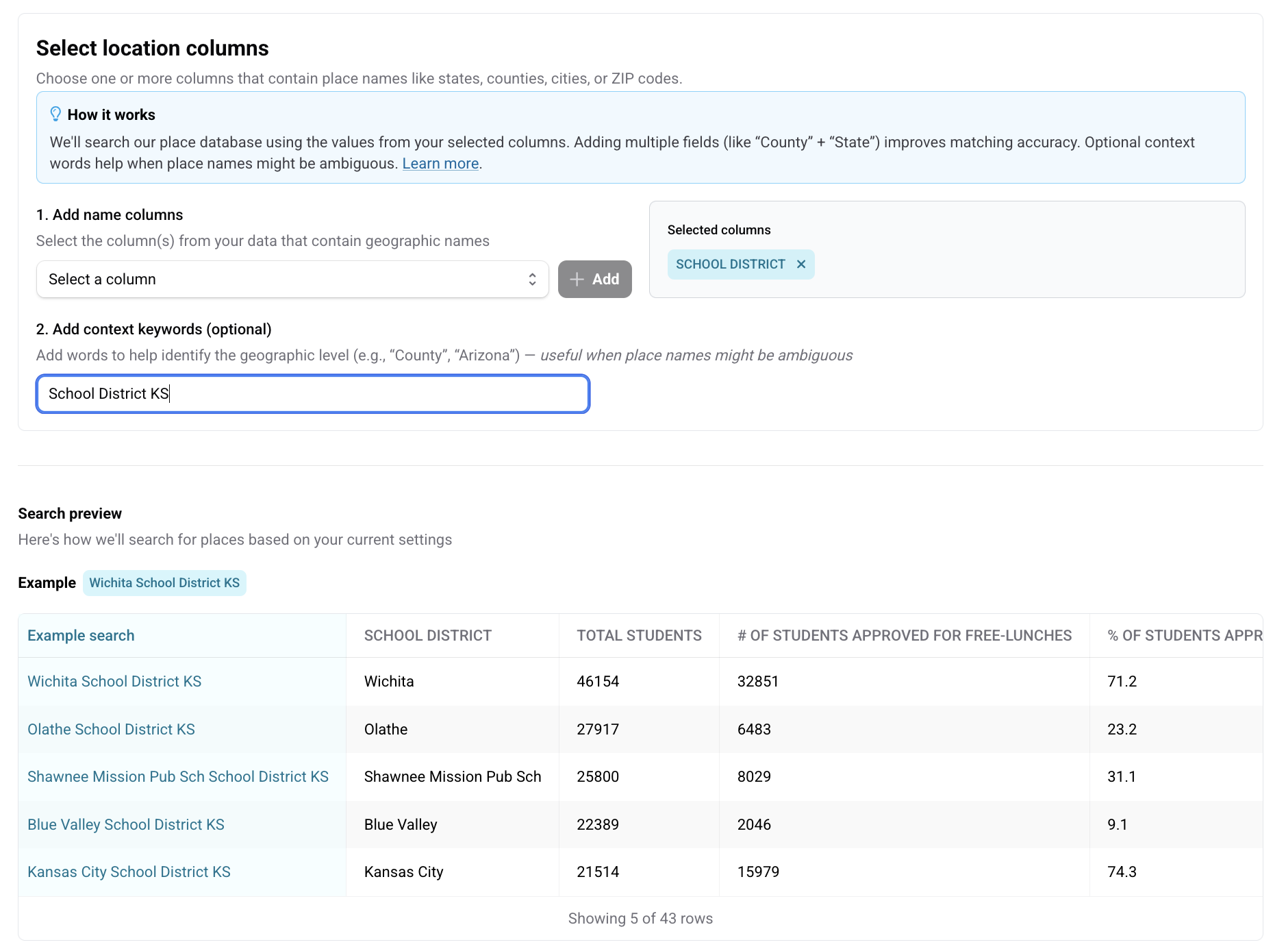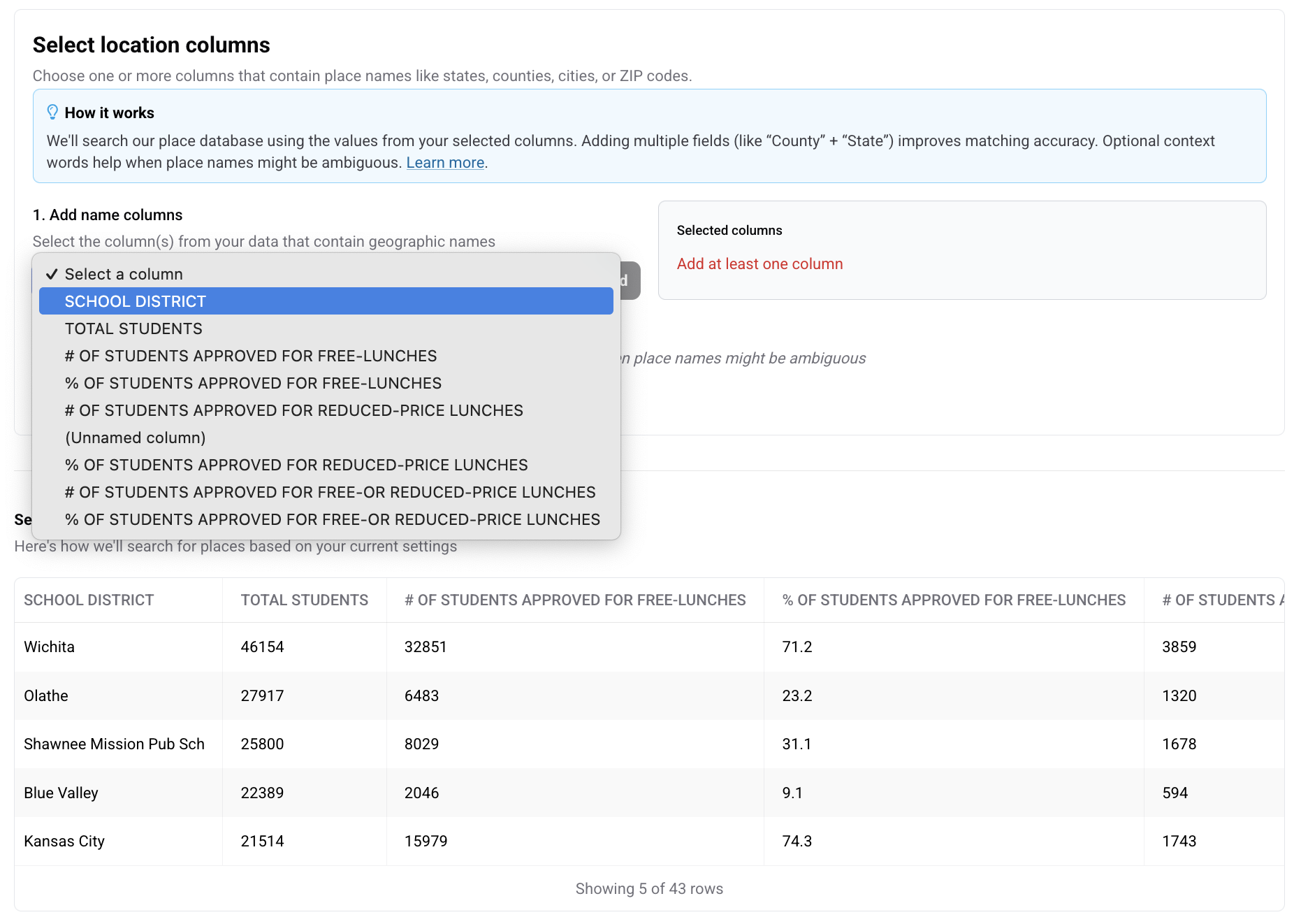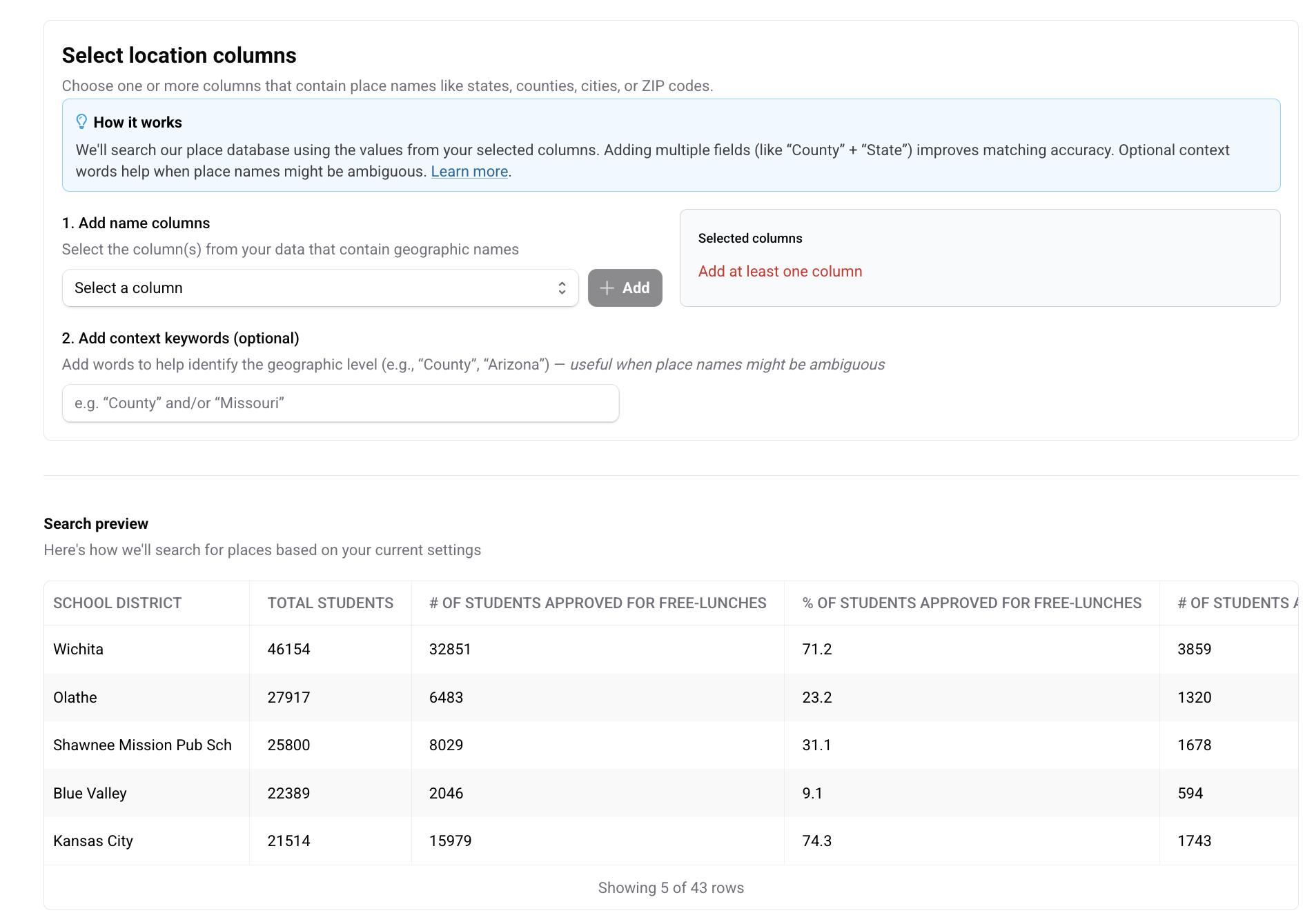 The far-left column shows you what term will be searched for each row. At this point, clicking Next would initiate the search and most rows would auto-populate with incorrect matches — cities instead of school districts.