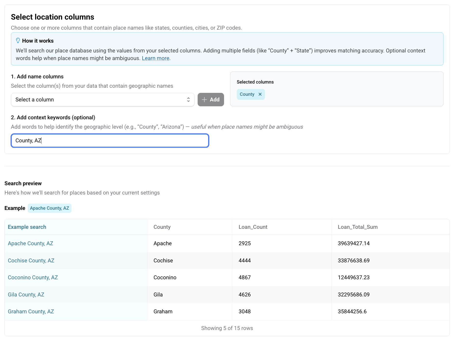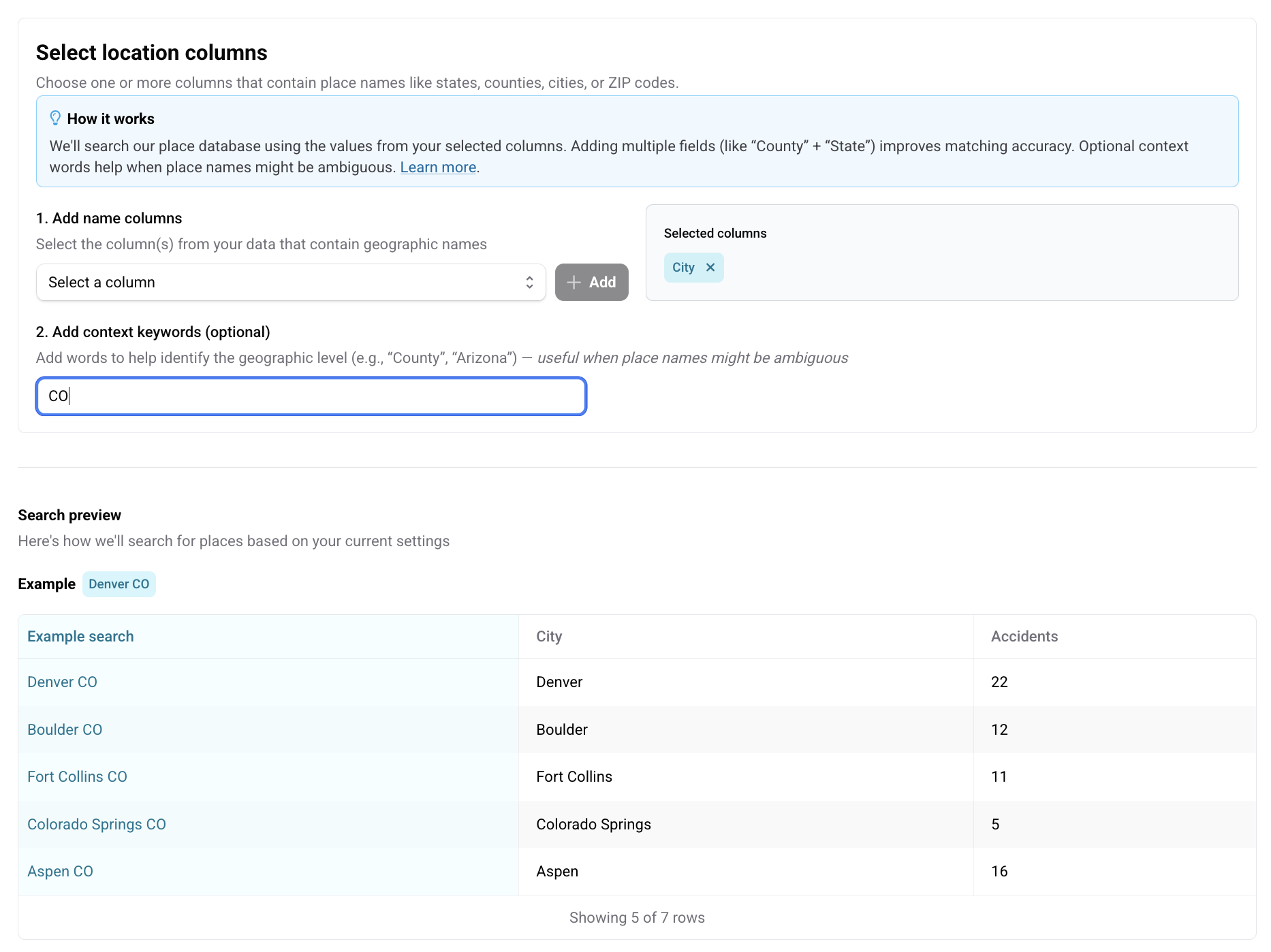 In this step, you're asked to select the column(s) that identify the place, and add optional keywords to help the system create a complete and accurate search.