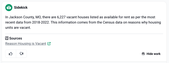 - Review Sidekick’s Response. Sidekick will process your question using the mySidewalk data library and provide a concise answer based on the most current data available. You can review "Sidekick's work" to ensure that it pulled the right data for your target geographies. See the article on Checking Sidekick's Work for more on how to use this important feature.