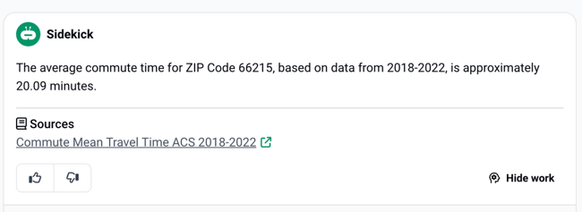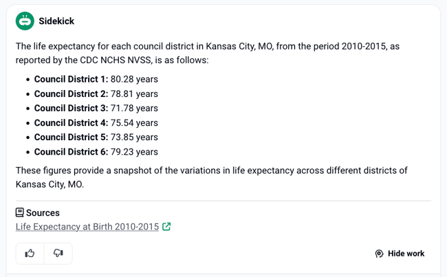 • Review Sidekick’s Response. Sidekick will process your question using the mySidewalk data library and provide a concise answer based on the most current data available. You can review "Sidekick's work" to ensure that it pulled the right data for your target geographies. See the article on Checking Sidekick's Work for more on how to use this important feature.