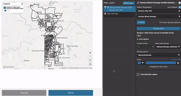 If the data is available for the new sub-geography you chose, the map will change from blank to filled with one color. To see how the data varies across your main geography, increase the number of data bins.