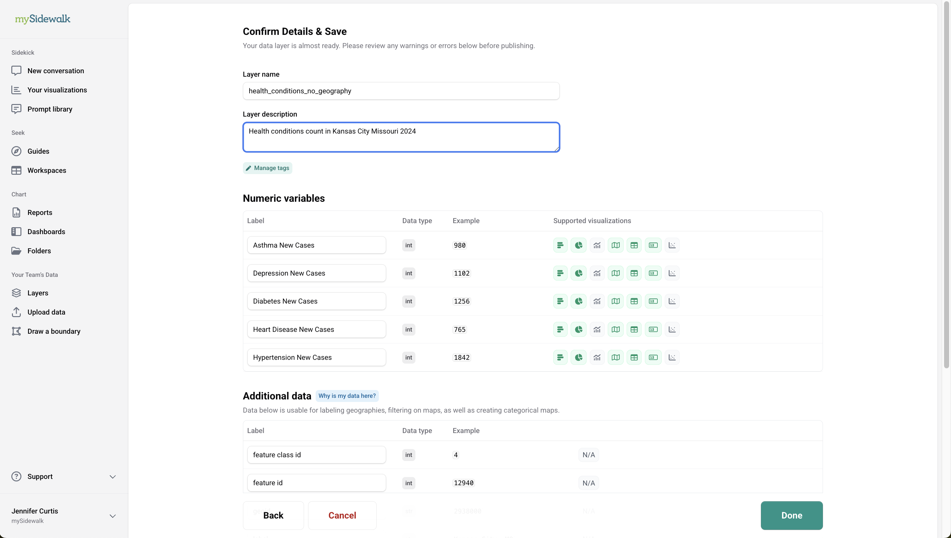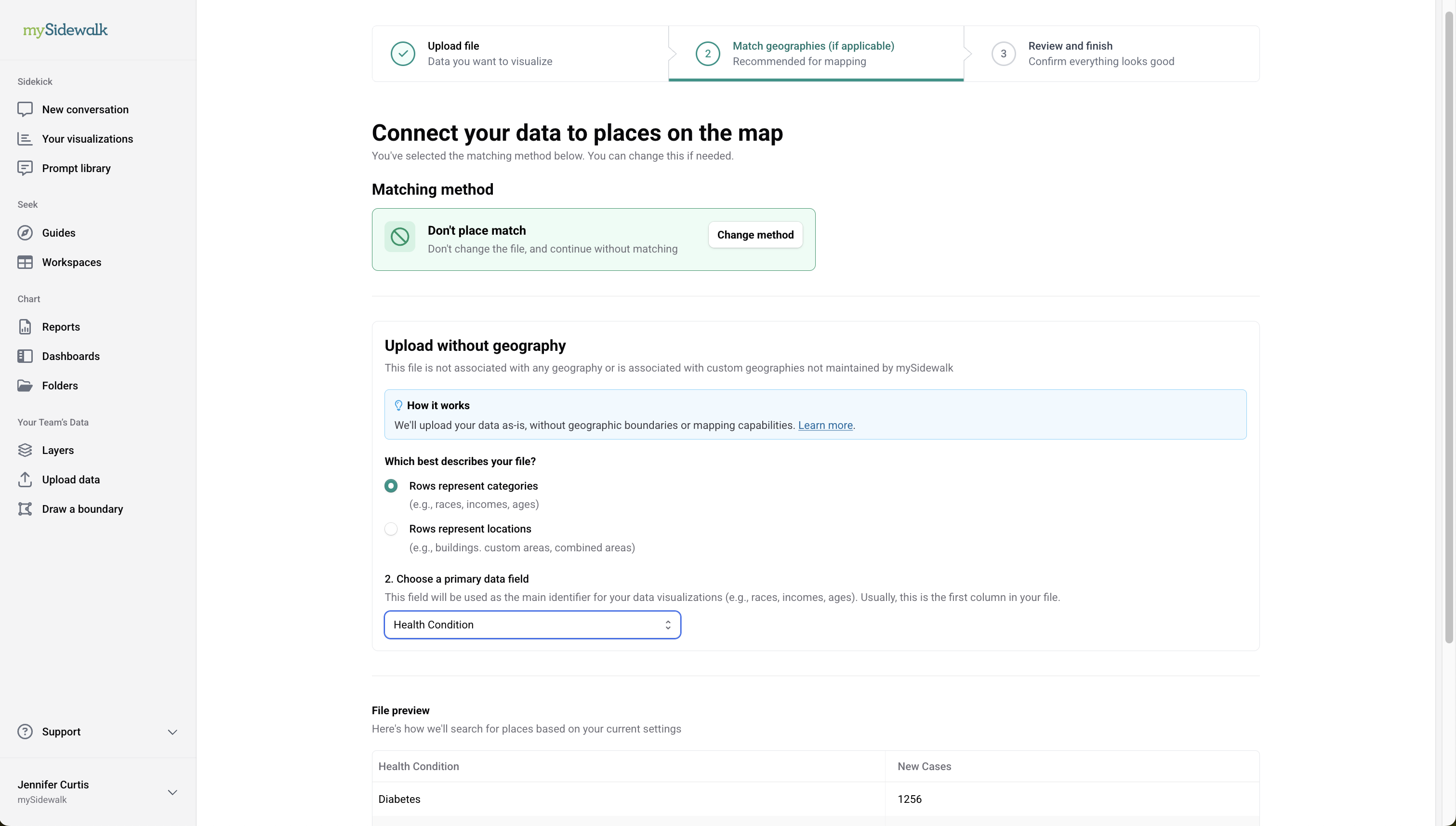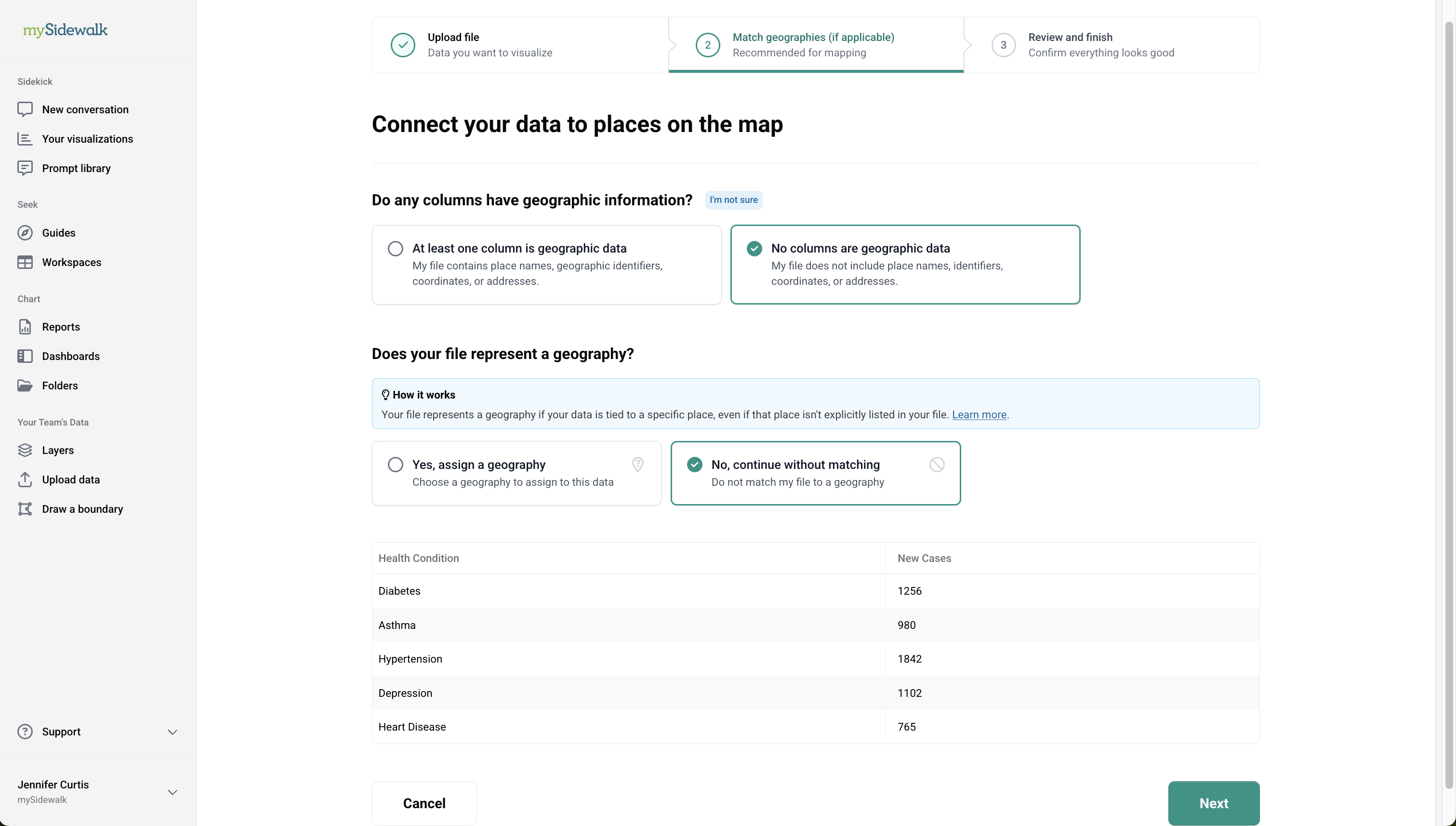 Your data is successfully uploaded. Since it’s not linked to a geography, some map-based functionality will be limited.