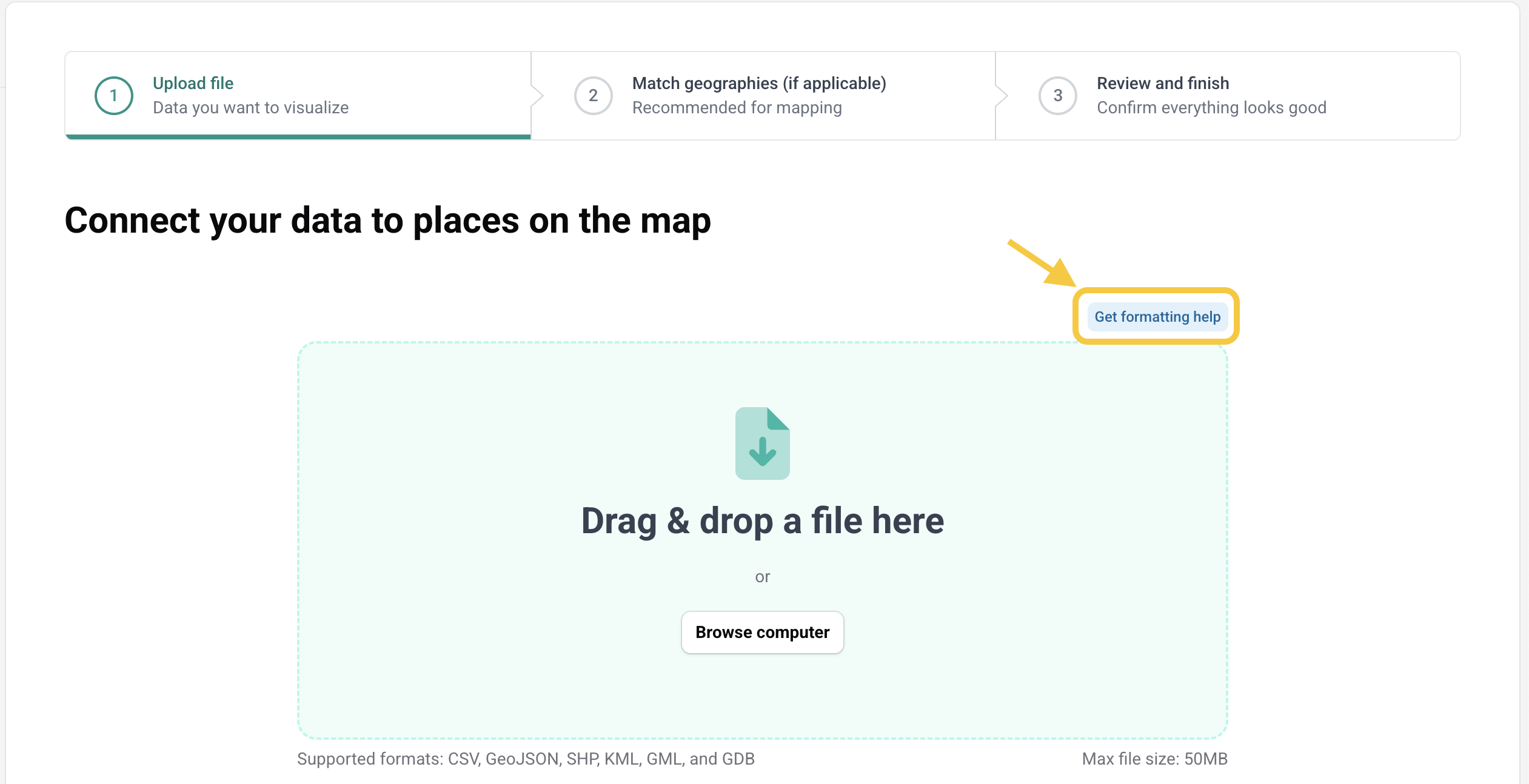 If you’re unsure which method to use or need support formatting your data, click the Get formatting help link on the upload page or start a chat with support.