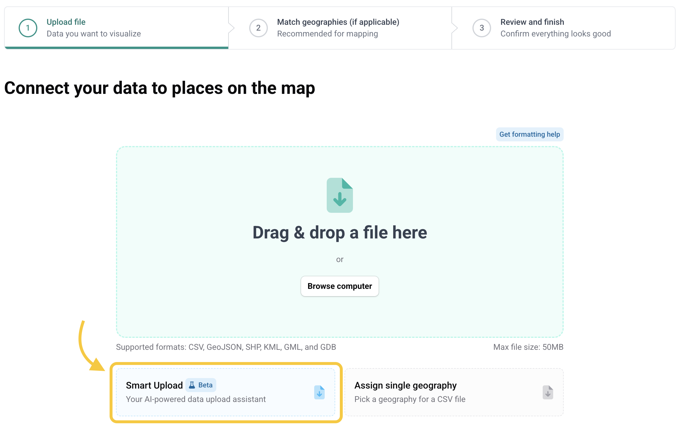 We support a wide range of data upload formats, from CSVs with place names to precise latitude/longitude coordinates.